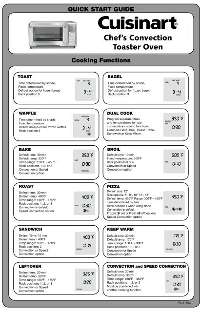 Individual cooking features include toast bagel waffle bake broil roast pizza sandwich keep warm and leftover.